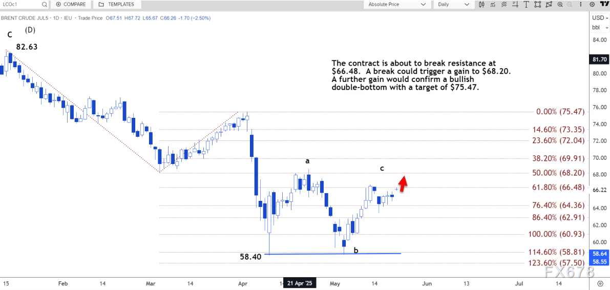 支撑位在65.81美元,跌破该水平可能跌至64.91美元。日线图显示,该合约即将突破66.48美元的阻力位。