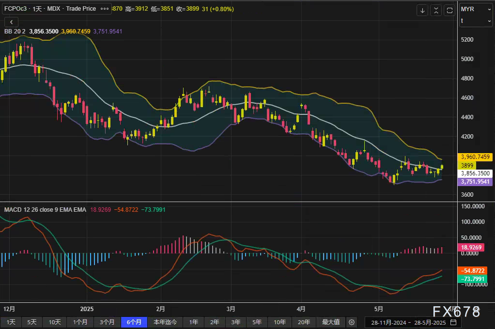 短期资金面主导行情   孟买植物油经纪商Sunvin Group研究主管Anilkumar Bagani指出:"棕榈油延续周二以来的空头回补行情,同时中国植物油市场的强势提供额外支撑。"盘面数据显示,大连商品交易所豆油主力合约(DBYcv1)微跌0.1%,而棕榈油合约(DCPcv1)上涨0.95%,芝加哥期货交易所(CBOT)豆油价格同期上涨0.4%。   汇率与原油边际影响   林吉特兑美元升值0.35%,小幅提升进口成本。原油市场方面,美国限制委内瑞拉原油出口的消息被OPEC+可能增产的预期抵消,国际油价维持横盘。需注意,原油价格持稳使棕榈油作为生物柴油原料的性价比保持稳定。   欧盟进口数据分化   欧盟委员会最新数据显示,2024/25年度(始于7月)截至5月25日,欧盟大豆进口量达1269万吨,同比增加7%;而棕榈油进口量257万吨,同比下降19%,反映需求结构性调整持续。   日线级别关键指标解析   布林通道:价格逼近中轨(3960林吉特),上下轨区间(3856-3751林吉特)呈收窄态势,波动率下降;   MACD指标:柱状图值为-73.7991,但快慢线(18.9269/-54.8722)负差值缩窄,短期卖压有所缓解;   关键位验证:   - 上方3960林吉特中轨构成首道阻力,突破后或测试4000林吉特心理关口;   - 若回落至3856林吉特下轨下方,可能重启调整趋势。