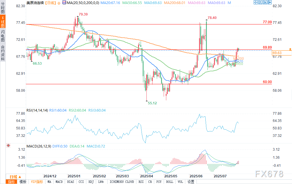 (WTI原油日图 ) 原油在69.89美元的技术面犹豫不决,再加上不断上升的地缘政治和政策阻力——从特朗普的关税威胁到美联储的复杂信号——表明短期前景谨慎看空。除非多头重新夺回并守住这一枢纽位,否则进一步下探至60美元中段支撑位的可能性很大。 北京时间19:37,WTI原油报69.65美元/桶,跌幅0.50%。