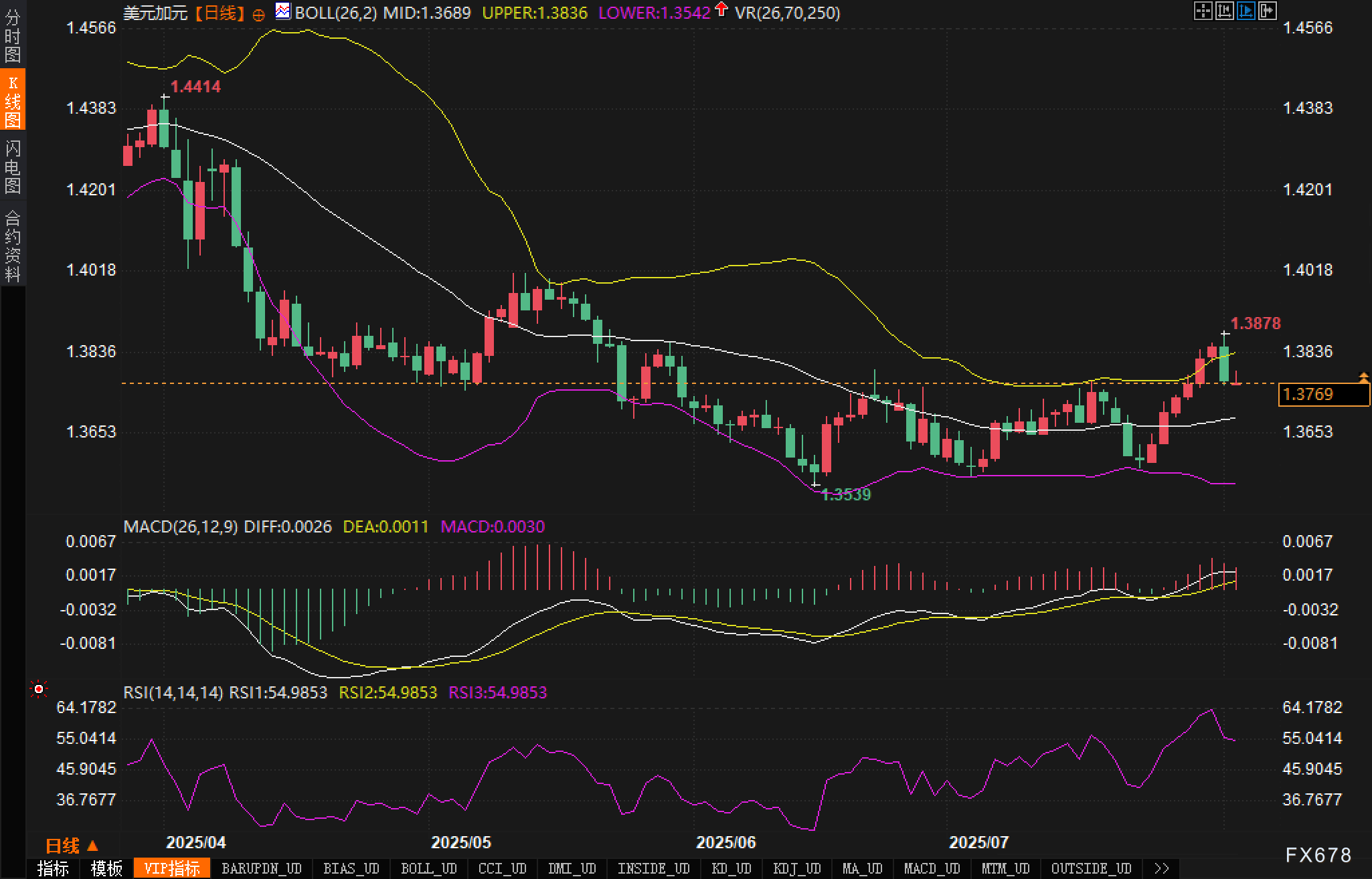 与此同时,美国总统特朗普突然撤换劳工统计局负责人,并指控其“操控数据”,此举不仅进一步削弱了市场对美国经济数据的信任,也加剧了美元抛售压力。反观加拿大方面,尽管上周加拿大央行选择按兵不动,但次日公布的负面GDP数据、低迷的原油价格及关税施压,均为加元前景蒙上阴影。在此背景下,加元在上破短期技术阻力后,多头动能是否具备持续性,成为市场关注焦点。 基本面 美国劳动力市场的降温信号尤为关键。7月新增非农就业仅为73000人,不仅远低于预期,更重要的是,前两月数据合计下修约26万人,重现疫情期间的就业增长疲态。此外,失业率意外上升、劳动参与率下滑,加剧了市场对经济放缓的担忧。随之而来的,是对美联储货币政策前景的迅速再定价。9月降息概率升至80%,大幅高于一周前的不足50%。 然而,政治因素亦成为市场避险情绪上升的催化剂。特朗普政府针对BLS的直接干预,令统计数据公信力受到质疑,美元信用风险随之上升。同时,美联储理事Kugler的提前辞职,给予总统进一步影响FOMC构成的机会,引发市场对未来货币政策独立性的担忧。考虑到目前美国加权平均关税已达18.3%,为近90年来最高,加之通胀尚未被完全压制,政策空间正在遭受多重夹击。 相比之下,加拿大经济虽未强劲,却因缺乏更严重失衡因素而短期获得相对优势。尽管6月GDP数据为负,令市场对加拿大经济增长产生质疑,但加拿大央行仍强调当前经济整体韧性尚在。然而,油价的疲软走势及对美出口压力上升,限制了加元中期上行空间。本周即将公布的加拿大IVEY PMI与就业数据,将成为观察多头是否有持续性的重要风向标。 技术面: 从日线图观察,美元/加元汇价自低点1.3539反弹以来,整体呈现出温和震荡上行趋势。布林带呈现轻微开口状态,中轨上移至1.3689附近,当前价格接近布林上轨1.3836附近运行,暗示短线仍有惯性上冲动能,但也面临技术性压力区。若能有效突破1.3880上方区域,则有望进一步测试1.4000整数关口;若未能企稳,将回测1.3769水平支撑,该位置亦为近期震荡平台的顶部,具有重要参考价值。
