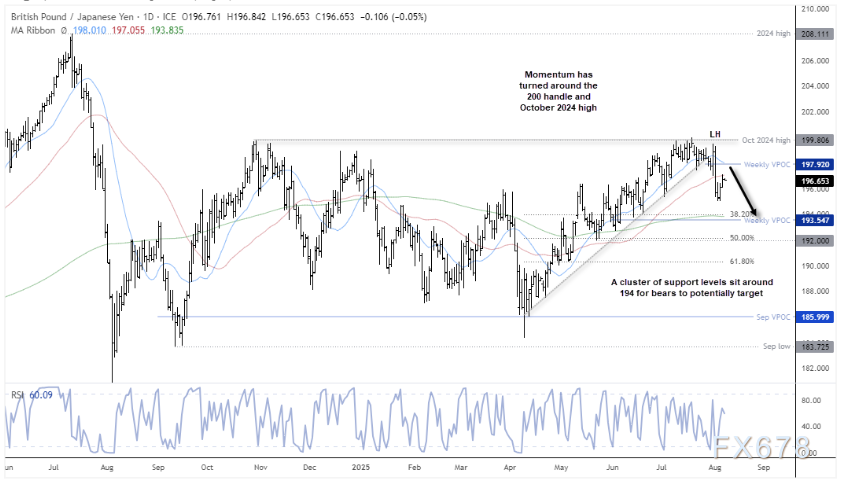 下行目标明确:近期看1.32及自5月低点一路上涨总涨幅的38.2%斐波那契位1.3140;跌破后焦点转向1.30关口与1.2938;若失守1.2900,则可能下探61.8%回撤位及4月低点上方的1.2700。 英镑兑日元技术分析:动能转弱,下行指向194的关键位 英镑兑日元自4月184涨至7月近200(遇阻2024年10月高点)后,跌破上涨趋势线并且价格形成更低的肩部,看跌动能加速。当前价格处于回撤阶段,与英镑兑美元类似,日线或形成因动能惯性形成没有成交量的高点。