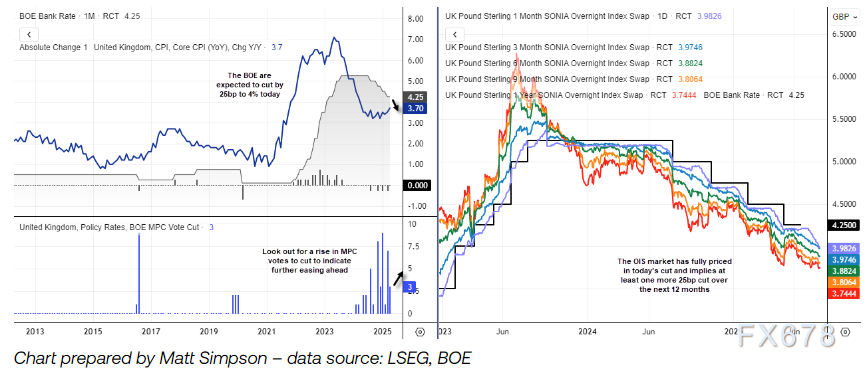 英国央行降息预期明确,市场押注进一步宽松 英国央行今日预计将利率下调25个基点至4%,隔夜指数掉期(OIS)市场已对此次降息进行完全定价,且价格隐含了鸽派倾向,1年期OIS显示未来12个月至少再降息25个基点。交易者需重点关注周四(8月7日)晚间的英国MPC会议的投票分布:若支持降息的票数增加,或暗示更多宽松将至,可能进一步压制英镑,尤其是叠加鸽派评论时。 此外,新西兰联储会议前,新西兰通胀预期值得关注:二季度劳动力成本上升0.6%(高于预期0.5%及前值0.4%),CPI同步上行;尽管失业率升至5.2%或支持降息,但持续通胀或迫使新西兰联储保持谨慎。 从英国央行政策预期与OIS定价看,左侧面板显示英国央行利率、核心CPI(年率3.7%)及MPC投票计数,指向降息25个基点至4.0%及进一步宽松信号;右侧面板英国SONIA OIS曲线显示1个月至1年期利率低于当前央行利率,确认市场对多次降息的预期——均支撑英镑兑美元因英国央行鸽派倾向承压的判断。
