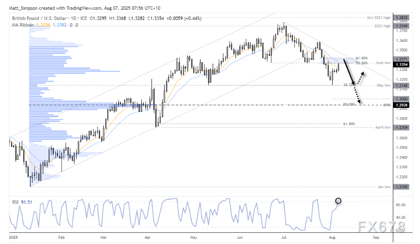 英镑兑美元日线视角:价格正测试6月低点与50%斐波那契回撤位附近的阻力1.3370,20日EMA(1.3392)、61.8%斐波那契回撤位(1.3420)与下降趋势线形成关键阻力区,空头或在此布局。RSI接近超买,短期动能虽偏上行,但或因动能惯性形成日线高点。
