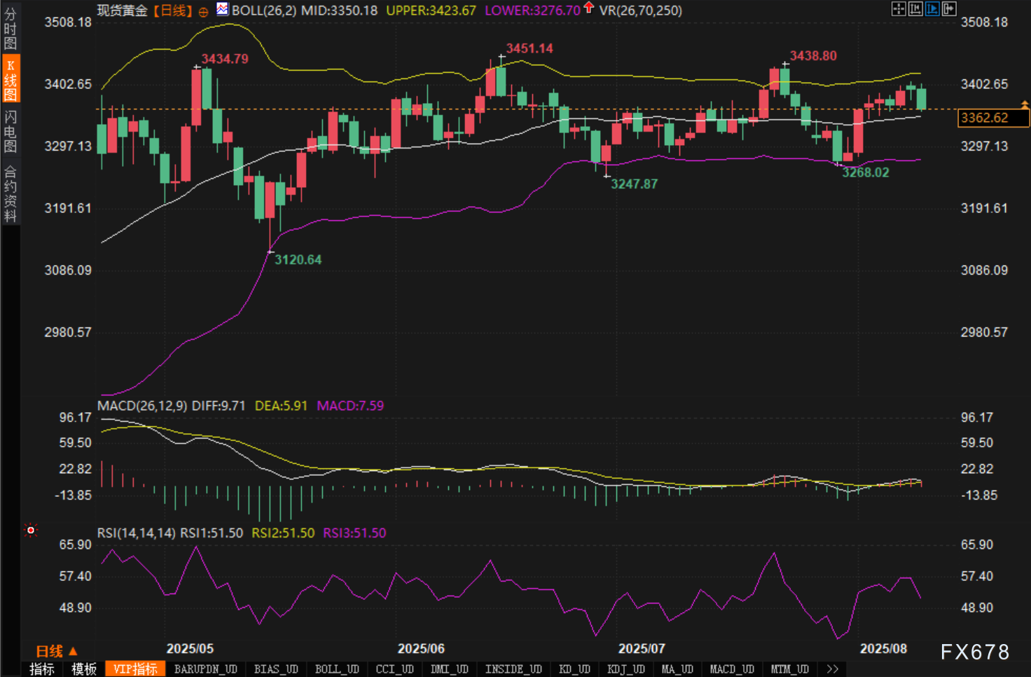 当前黄金价格已接近布林带的中轨(3350.18美元),这表明市场正处于震荡整理阶段。若价格突破3400美元并稳定在该价位上方,可能会迎来一波上涨浪潮,目标可以看向3450-3500美元区间。然而,若价格未能突破3400美元并回落至3250美元区域,则下行风险依然存在。 MACD线显示出短期内黄金价格的上行动能相对较弱。尽管DIF(9.71)和DEA(5.91)有交叉的迹象,但红柱动能微弱,这意味着短期内黄金价格的上行空间有限。当前市场的动能仍然不足以支撑黄金强势突破,因此,短期内仍需警惕回调风险。 市场情绪观察 当前黄金市场情绪复杂。一方面,股市和美国期货市场的表现来了市场的乐观情绪,使得黄金的避险需求有所减弱。另一方面,全球贸易摩擦、美国与俄罗斯的会谈,以及即将发布的通胀数据,依然给市场带来不小的压力,交易员对未来经济的不确定性保持高度警觉。 后市展望 多头展望: 从技术面来看,若黄金价格成功突破3400美元的强阻力位,并稳固在该区域,预计黄金价格将开启新的上涨波段。考虑到市场普遍预期美联储将在9月降息,并且全球政治风险依然存在,黄金作为避险资产的需求将继续保持。因此,若价格突破3400美元,目标可看向3450美元至3500美元区间。 空头展望: 若黄金价格未能突破3400美元并持续回落至3250美元区域,则可能会出现进一步的下行风险。在此情况下,黄金将面临较强的技术性回撤压力,后市支撑位将依次关注3200美元、3150美元等重要心理关口。