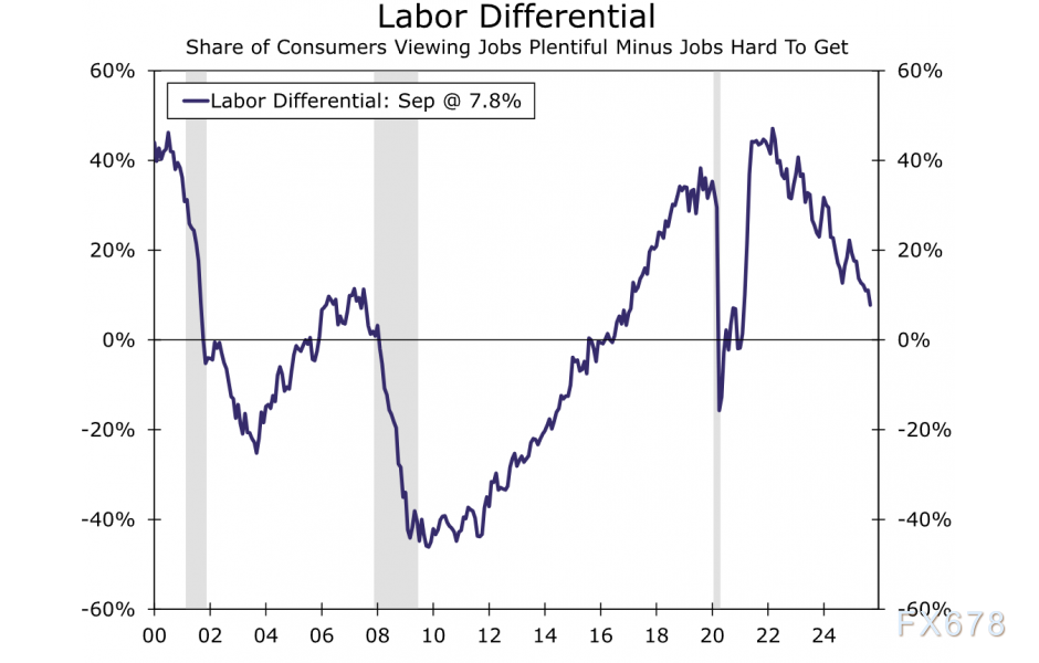 是否需要转换视角? 要准确把握当前美国消费者的真实心态,市场更倾向于借助“就业差指数”(见图表)这组透视镜。该传统指标通过“就业充足”与“就业难寻”两项数据的差值构建。其持续下行的趋势线,正映射出过去两年劳动力市场逐渐失速的实况。