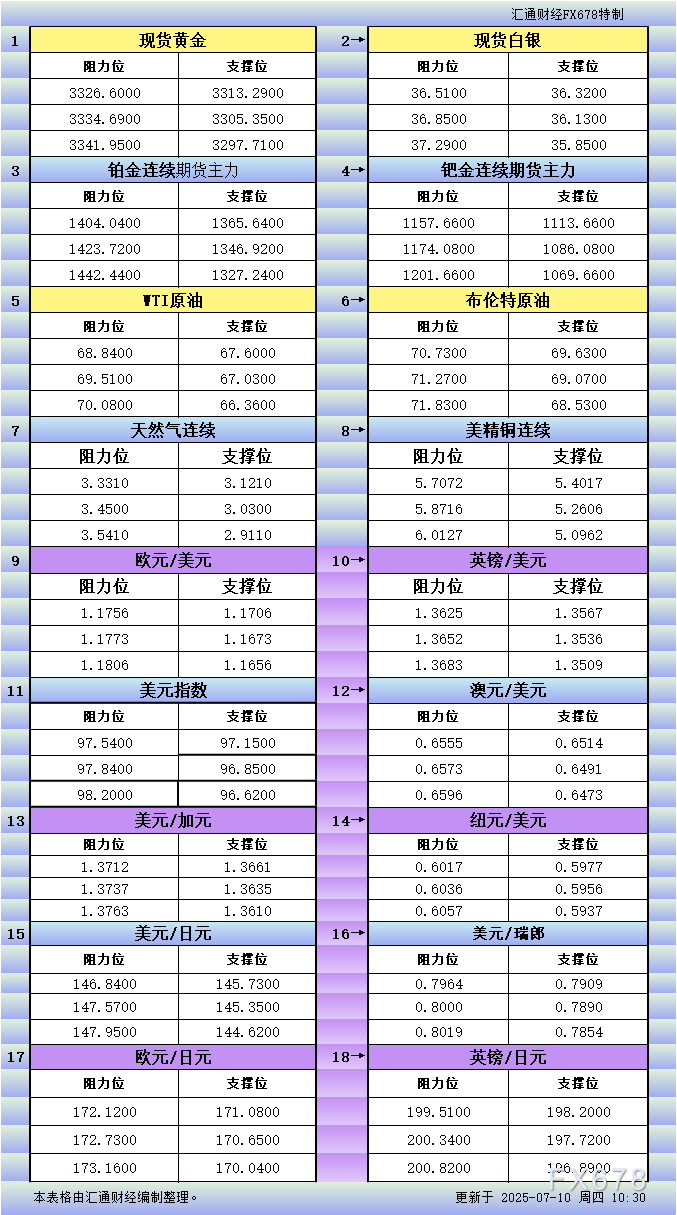 XM外汇官网7月10日亚市更新支撑阻力:18品种支撑阻力(金银铂钯原油天然气铜及