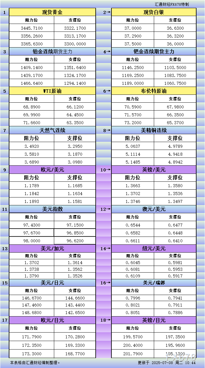 XM外汇官网登陆入口7月7日亚市更新支撑阻力:18品种支撑阻力(金银铂钯原油天然